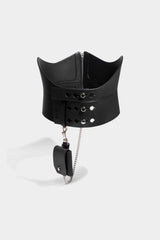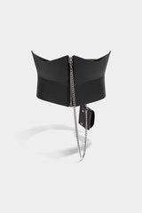 The Chain Zip Pocket Corset is constructed from smooth saddlery leather. This corset features a central zip connected to a metal slim which links to the pocket. This corset is a statement piece with subtle curves creating a dramatic silhouette by highlighting the bust and cinching the waist.