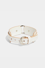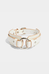 The Chunky O-Ring Collar is made from ivory smooth saddlery leather. It features a large ring at the front, fastened to layered leather straps with stud detailing, and a rear adjustable buckle.