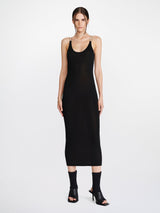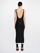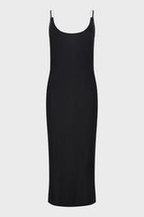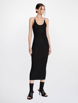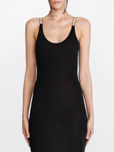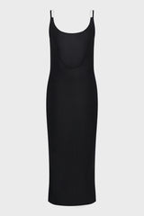 Black double wire slip dress from Dion Lee. It is a sleeveless midi dress crafted in a semi-sheer lustrous viscose knit with a slinky hand feel. Featuring brushed rhodium moulded wire hardware at shoulders for a suspended effect. Designed for a close fit with a low scooped back.