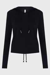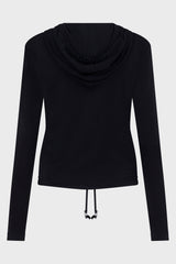 Black lustrous shrunken hoodie from Dion Lee. It is a long sleeve hooded top cut in a lustrous viscose jersey. Fabrication has a luxe, slinky hand and drapes over the body. Detailed with kangaroo patch pocket and flat tubular drawstring at hood and hem with silver-tone cord stoppers.
