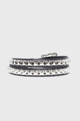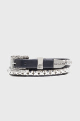 Belt made of hand-stained vegetable tan cowhide leather. Erd-branded hardware with extensive hand studding throughout.